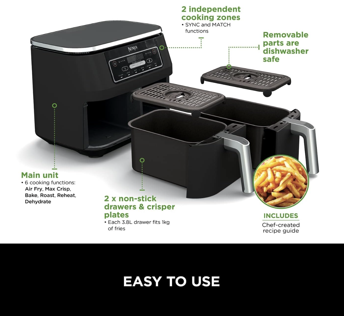 - INCLUDES: Ninja Air Fryer (UK Plug), 2x Non-stick, dishwasher-safe 3.8L Drawers (7.6L total capacity) & Crisper Plates. Chef-Created Recipe Guide. Weight: 8.2kg. Colour: Black.